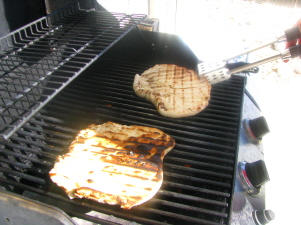 It can be tough to get the raw, flimsy dough onto the grill. Use either a pizza peel, sprinkled with cornmeal, or even a plate to flip the dough onto the grill. (I used a paper plate and turned it upside down to drop the dough onto the grill.)