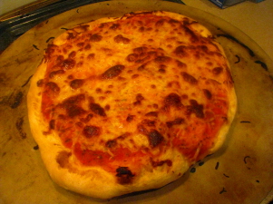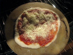 If using a pizza pan or baking sheet, spray Pam on pan (or lightly grease). Place dough in pan. If using stone, gently pull the rack with the stone out of oven and place dough on stone (using a pizza peel works best, but I just used my hands to drop it onto the stone - careful not to burn yourself!). pizza sauce recipe of your choice and add toppings.